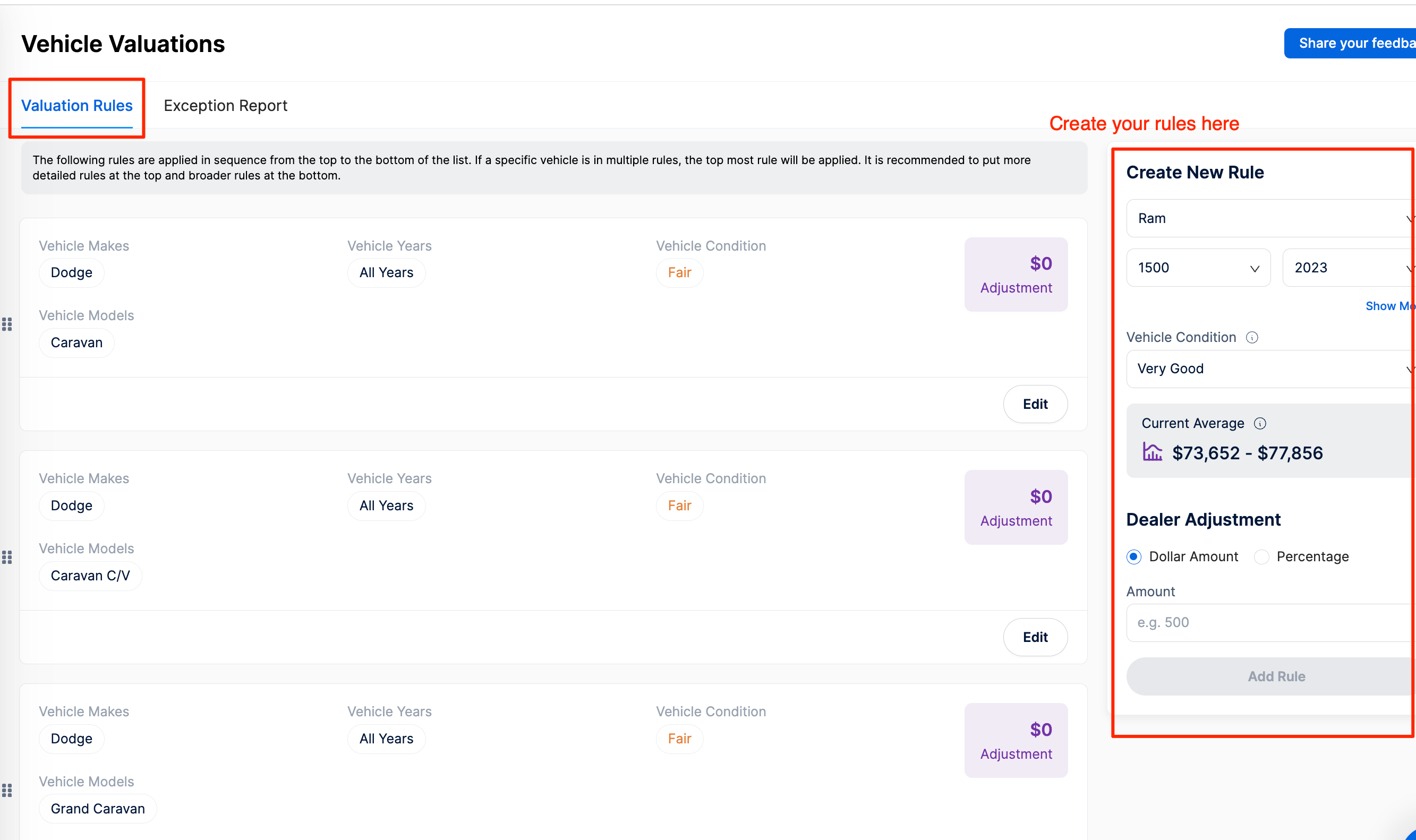 - 2. Under "Create New Rule," select the Make, Model, and Year for the vehicle you want to create a rule for, or choose multiple models within one make. Adjust the "Vehicle Condition" and optionally add a dollar or percentage adjustment. If you select a specific model and year, you will see the current average valuation.