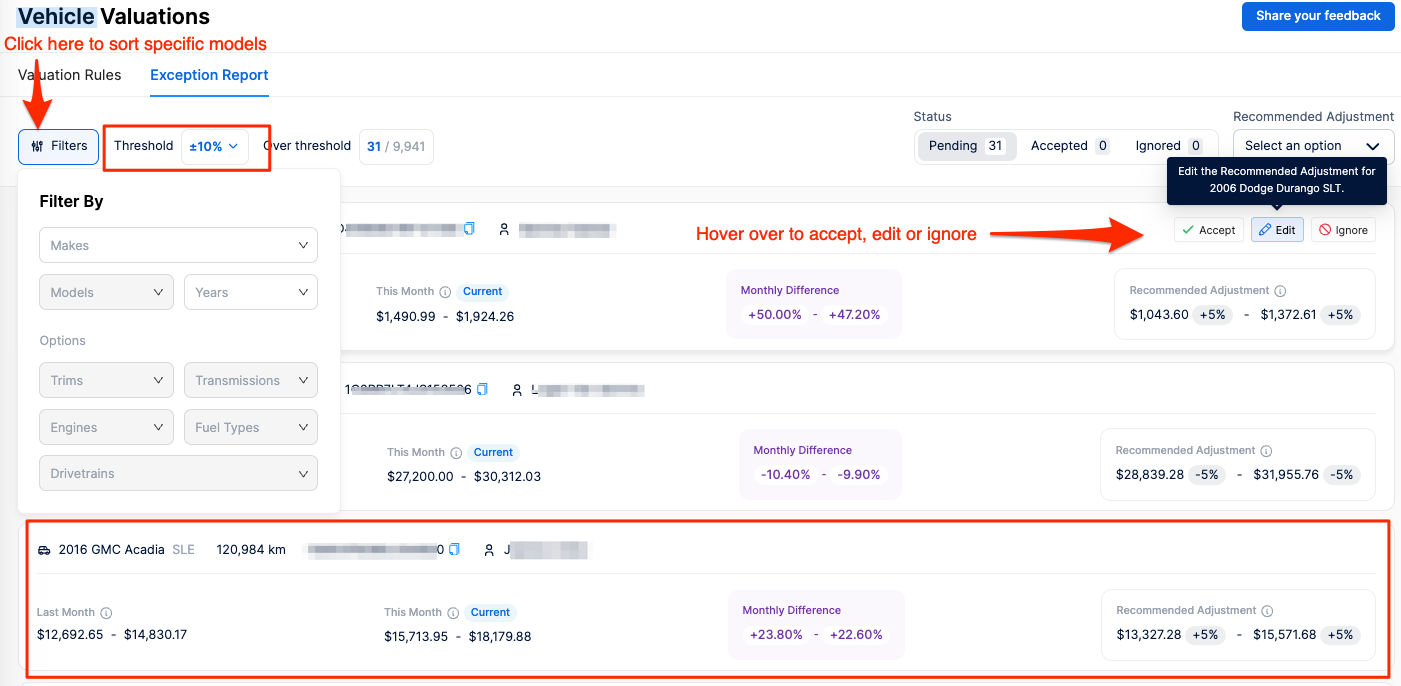 Note: If you wish to view valuations for all models, regardless of fluctuations, change the threshold to 0%. Should you identify entire model lines that do not align with your expectations, please create a Valuation Rule.