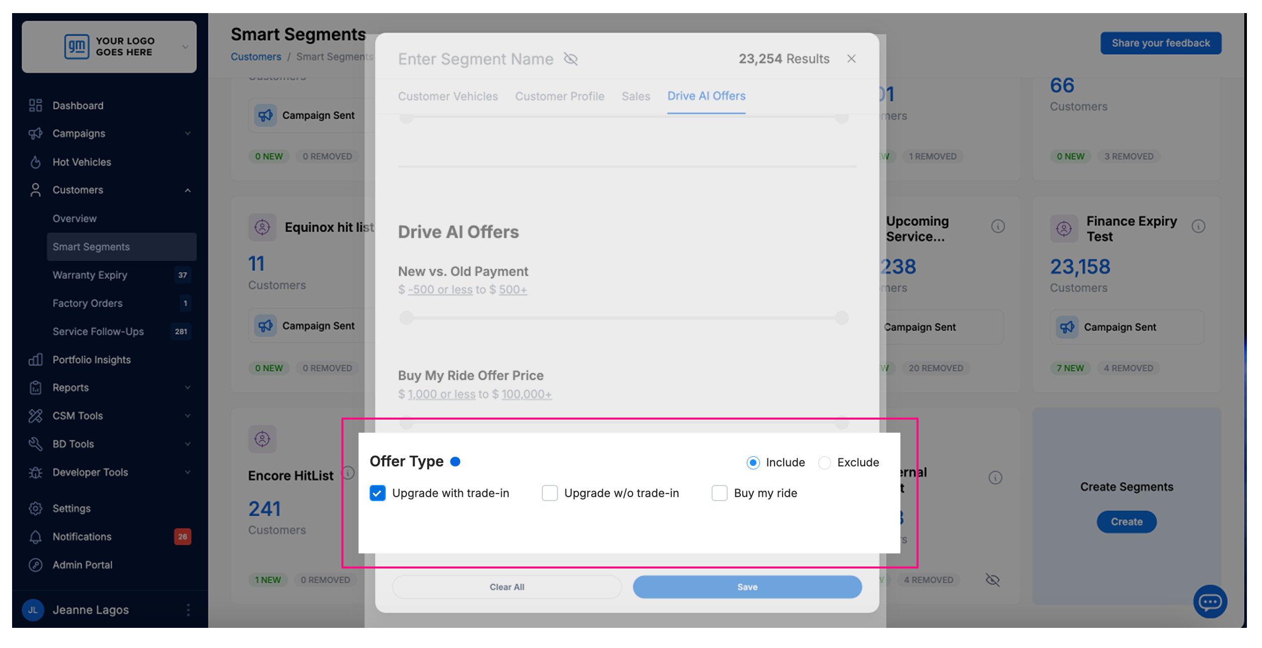 We want you to get the most out of Drive AI by reaching the right customers at the right time. To help with that, we’ve added a new way to filter customers in Smart Segments based on the type of Drive AI Offers they already see in their portal.
