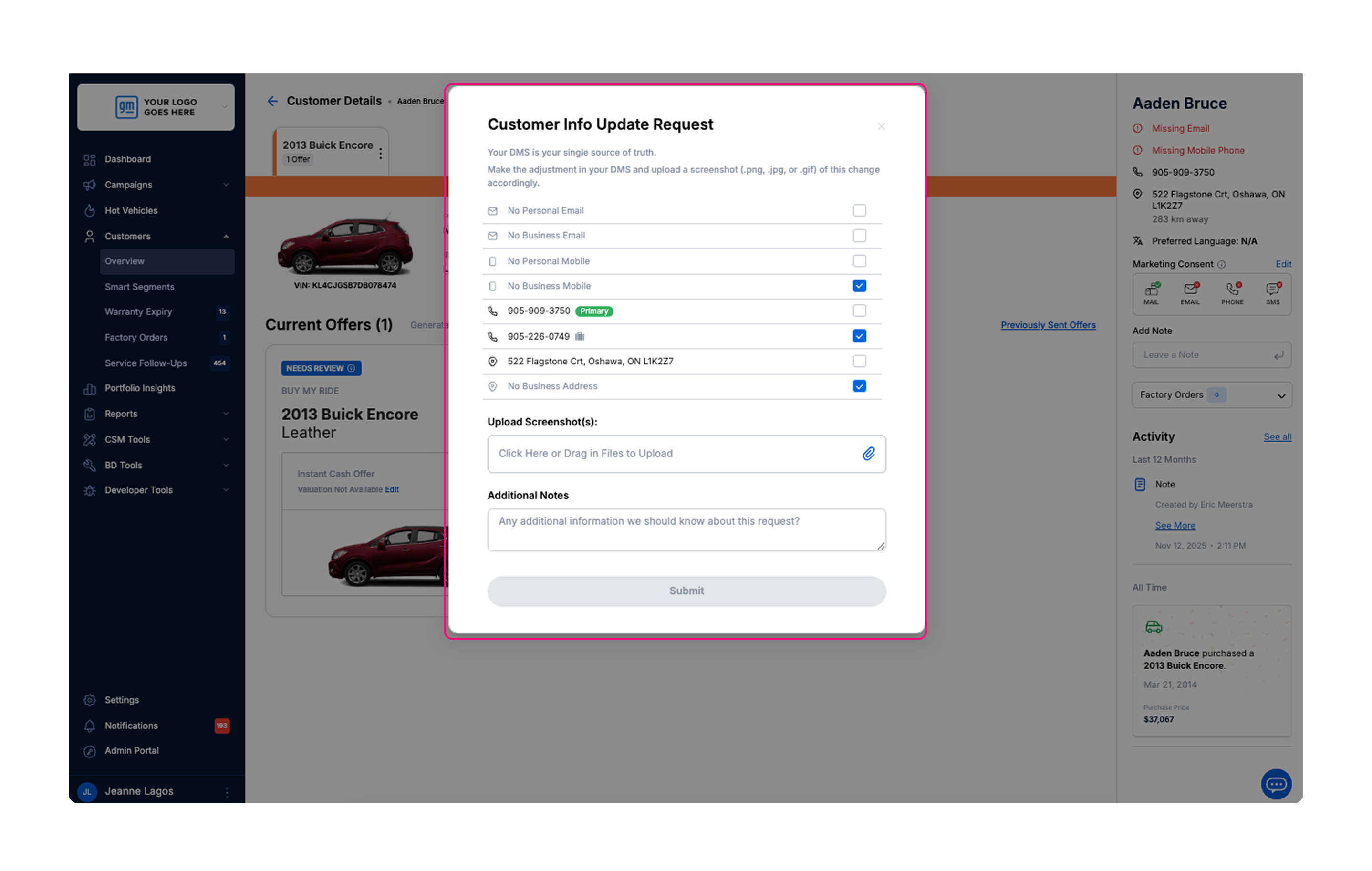 If you need the info updated in Drive AI immediately, you must first update the details in your DMS, then submit a request through the Drive AI portal with a screenshot for verification. This allows our team to update the record without waiting for a new transaction.