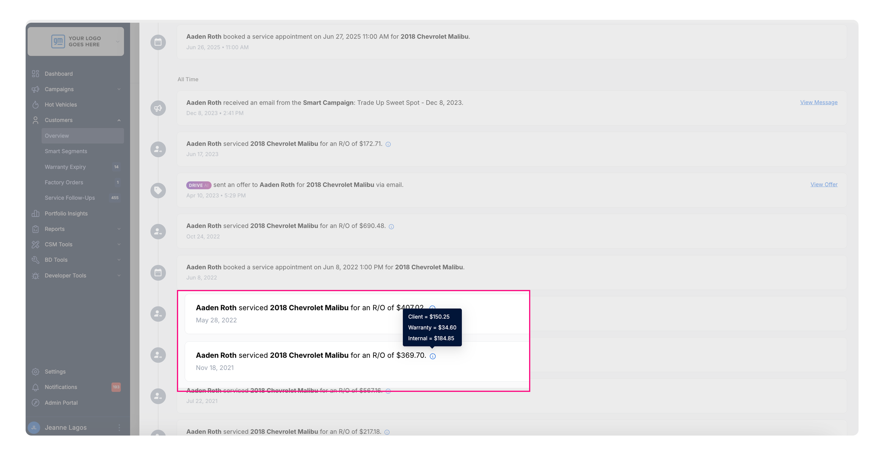 Weโve updated the Customer Activity feed to give dealers a much clearer picture of their service department's impact. Instead of showing only what the customer paid out-of-pocket, Drive AI now displays the total value of the Repair Order (R/O).