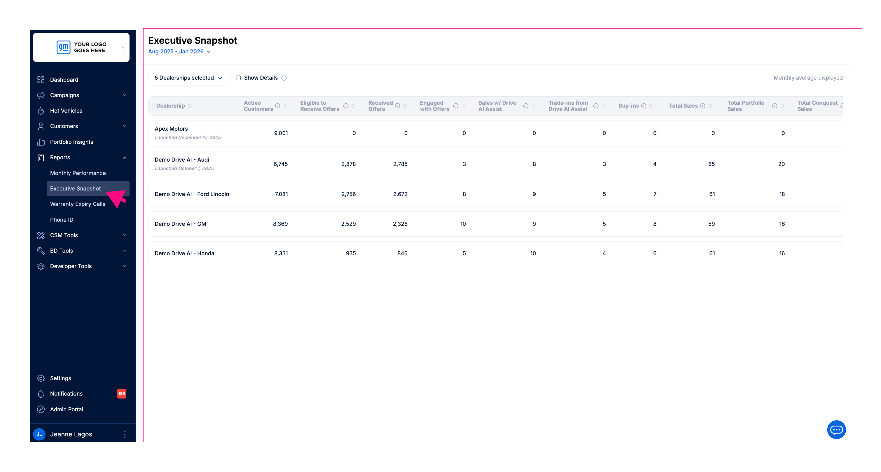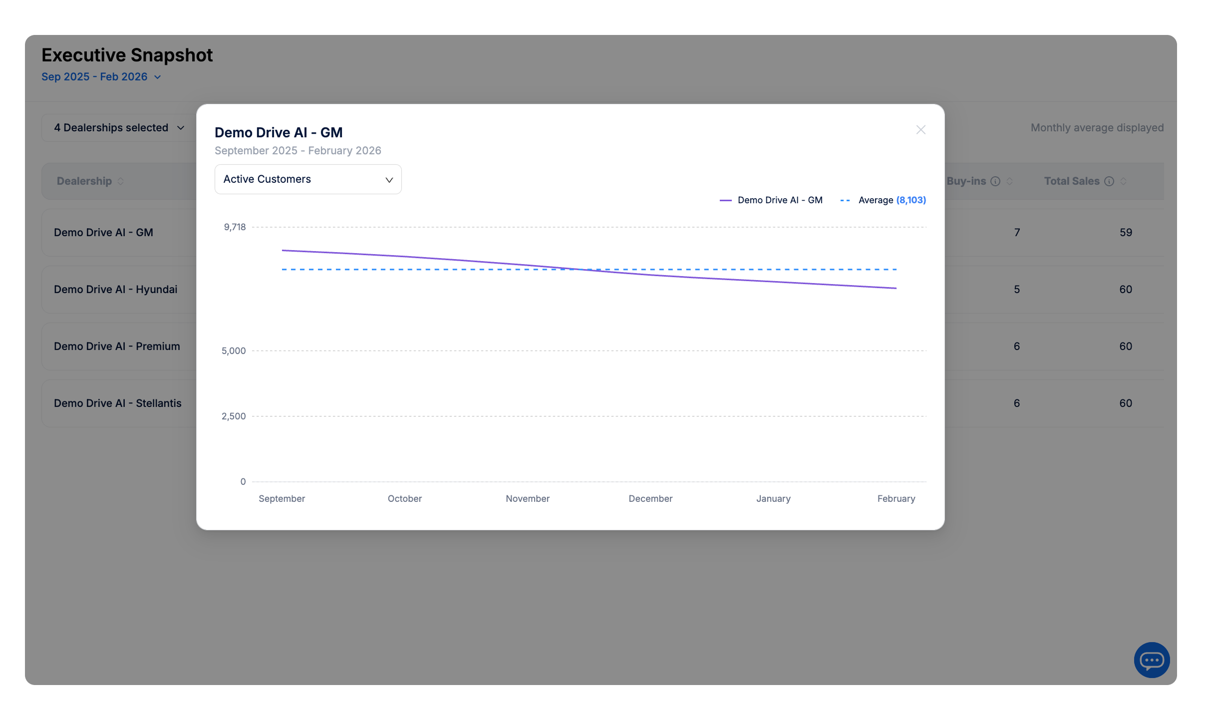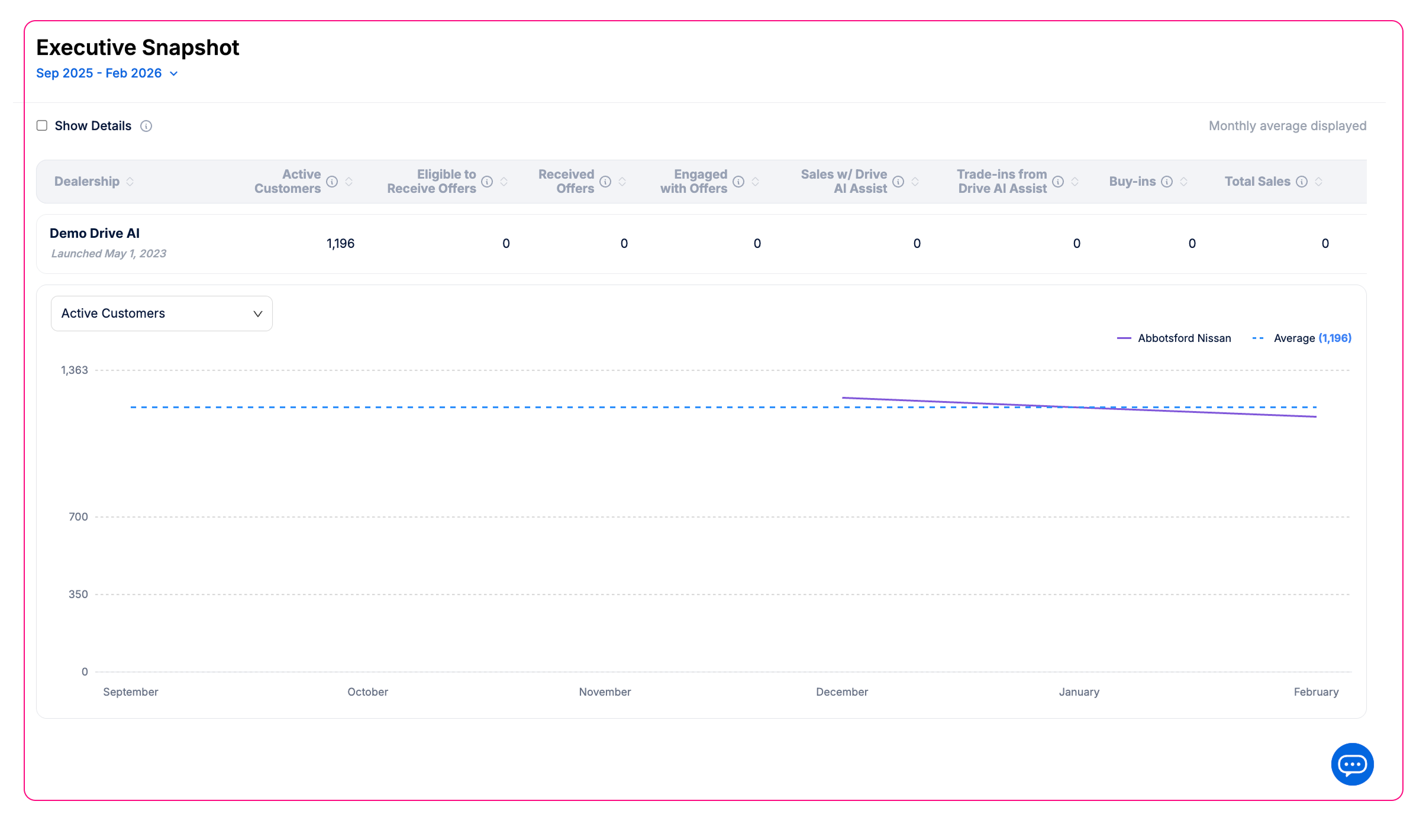 The Executive Snapshot: This is your high-level overview. It uses a table view to show consolidated data and monthly averages across one or many dealerships, highlighting your portfolio’s addressable market and customer engagement.