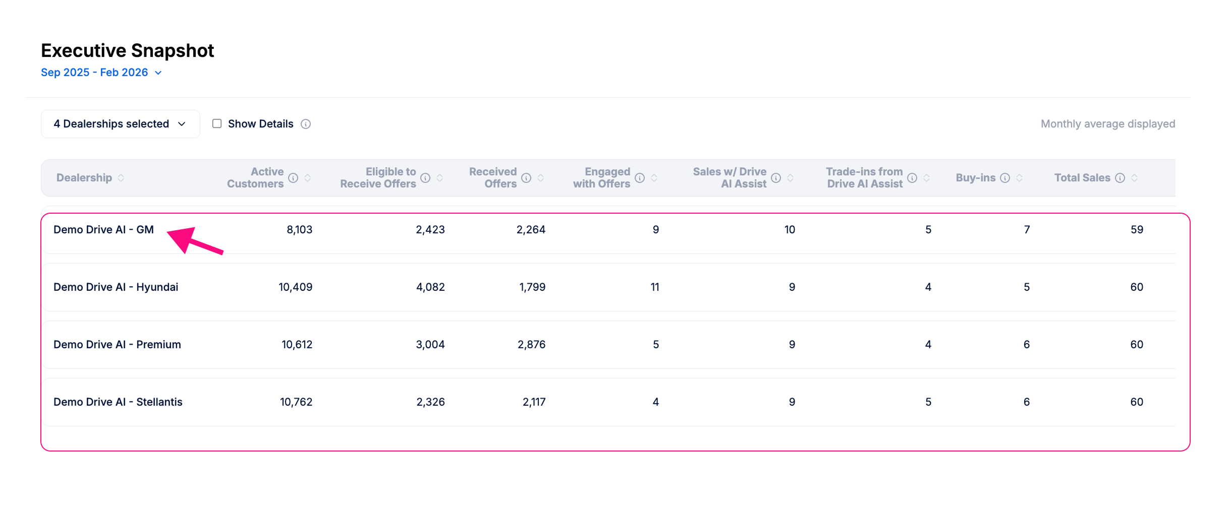 View performance across all stores using Drive AI that you manage in a clean, column-based grid. Each store appears in its own row, making it easy to compare results across rooftops. This quickly identifies which stores are leading or need attention.