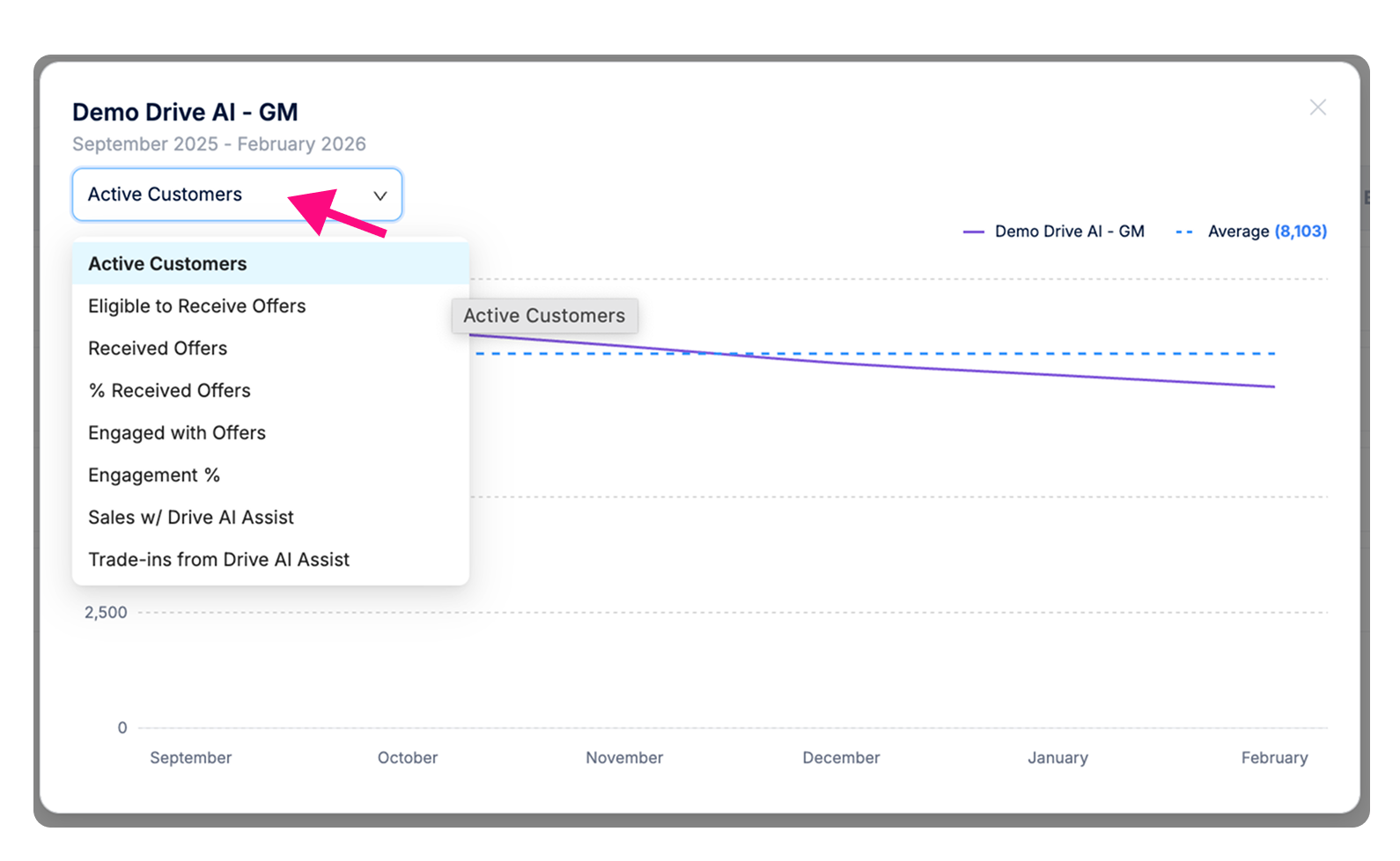 Within the chart view, use the dropdown menu to switch between different metrics (e.g., Active Customers, Engagement %).