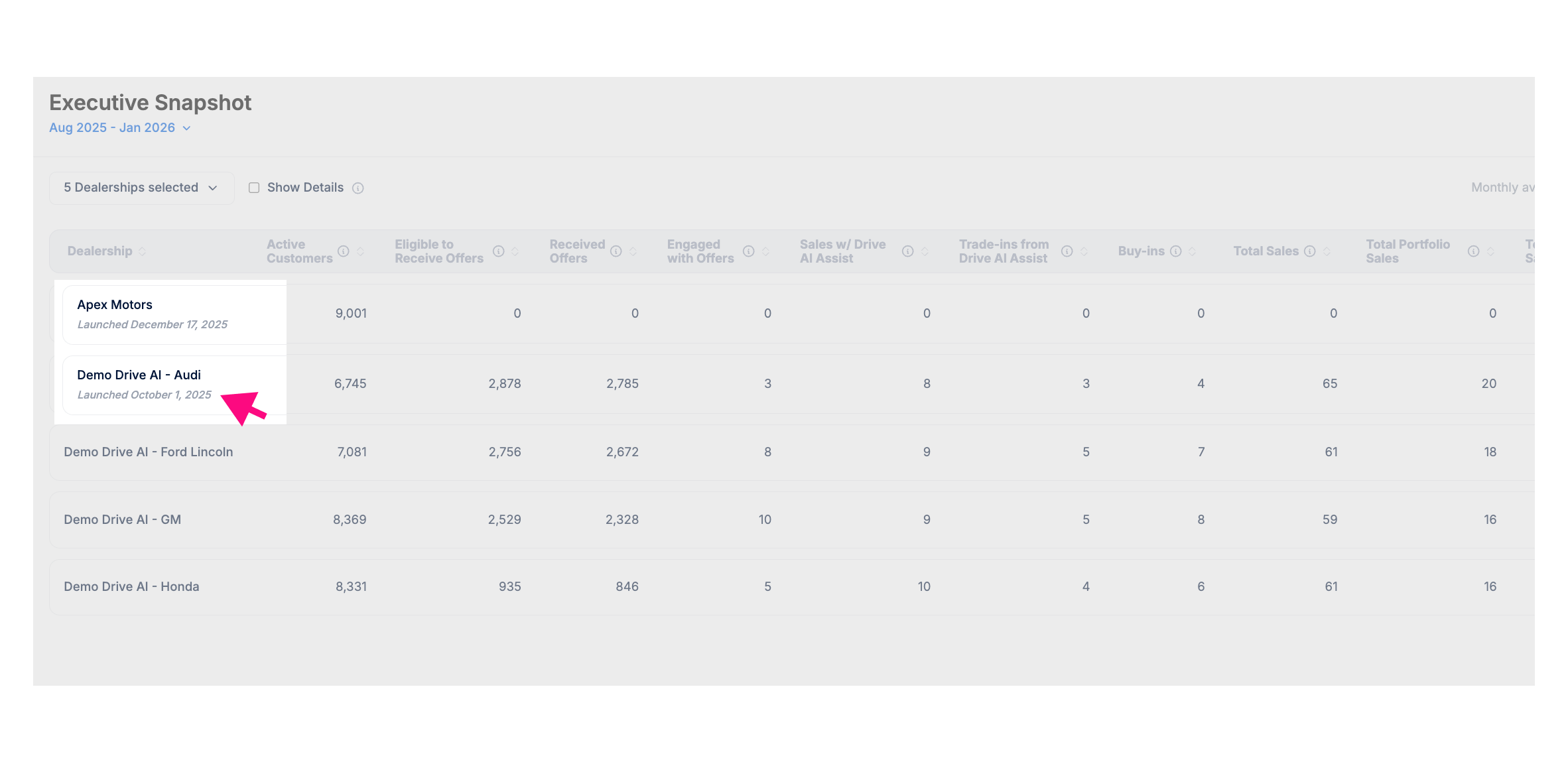 If a selected dealership does not have data for the full date range you selected, the Executive Snapshot will display a Launch Date label for that store, and its displayed data will only include the full months that dealership has been on Drive AI within the selected date range.